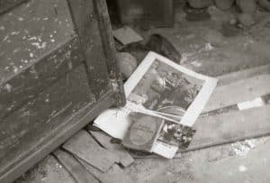 מלחמת השחרור- הריסות - על הריצפה דף עיתון ובו תצלום של היטלר, 1948. צילום מתוך ארכיון המדינה, בנו רותנברג תצלומים ותשלילים