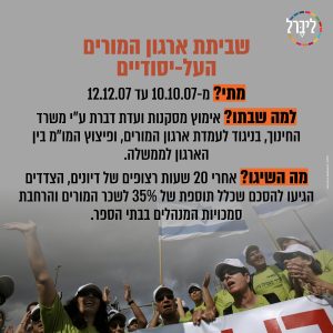 זו היתה השביתה הארוכה ביותר בהיסטוריה של מערכת החינוך בישראל. היא הגיעה אחרי משא ומתן ארוך, שנמשך כחמש שנים, בין משרדי החינוך והאוצר לבין שני ארגוני המורים בישראל - ארגון המורים העל יסודיים והסתדרות המורים, על הסכם קיבוצי חדש שיגדיר את תנאי ההעסקה של המורות והמורים במערכת החינוך.במקביל, הקימה הממשלה את ועדת דברת, שנועדה להמליץ על שינוי כולל במערכת החינוך. ב-2005 פרסמה הוועדה את המלצותיה, שהיוו את הבסיס לרפורמה שהממשלה החליטה לקדם במערכת. עוד בזמן שהוועדה עבדה על ההמלצות, ארגוני המורים הביעו הסתייגות ממנה, בעיקר על רקע העובדה שלא נקראו לקחת חלק פעיל בעצמם באותם דיונים. המלצות הוועדה קידמו בין היתר פגיעה באוטונומיה של הצוותים החינוכיים, בשעות העבודה ובתנאי השכר, וכן פיטורים של מורים רבים.לאחר החלטת הממשלה על ביצוע הרפורמה בהתאם להמלצות ועדת דברת, החליטה הסתדרות המורים להתיישר עם הרפורמה וחתמה על הסכם עם הממשלה. ארגון המורים, לעומת זאת, סירב להצטרף להסכם, וחברי הארגון פתחו במאבק לשינוי הרפורמה - מאבק ששיאו היה באותה שביתה ב-2007.ב-10 באוקטובר באותה שנה, כ-40 אלף מורי הארגון פתחו בשביתה, ובתי הספר העל-יסודיים, בהם למדו אז כ-550 אלף תלמידים - הושבתו. המורים יצאו להפגין במקומות שונים בכל רחבי הארץ ונקטו בגימיקים שונים למשוך את תשומת הלב של הציבור למאבק, כמו למשל כניסה לים כסמל לטביעת מערכת החינוך, וכן הגעה לוועידת אנאפוליס שהתקיימה באותה תקופה, כדי למשוך את תשומת ליבו של ראש הממשלה דאז, אהוד אולמרט.ב-13 בדצמבר 2007 לפנות בוקר, בתום 20 שעות של דיונים רצופים, הגיעו הצדדים להסכם, ובו ביום המורים חזרו ללמד, ובתי הספר שבו ונפתחו.