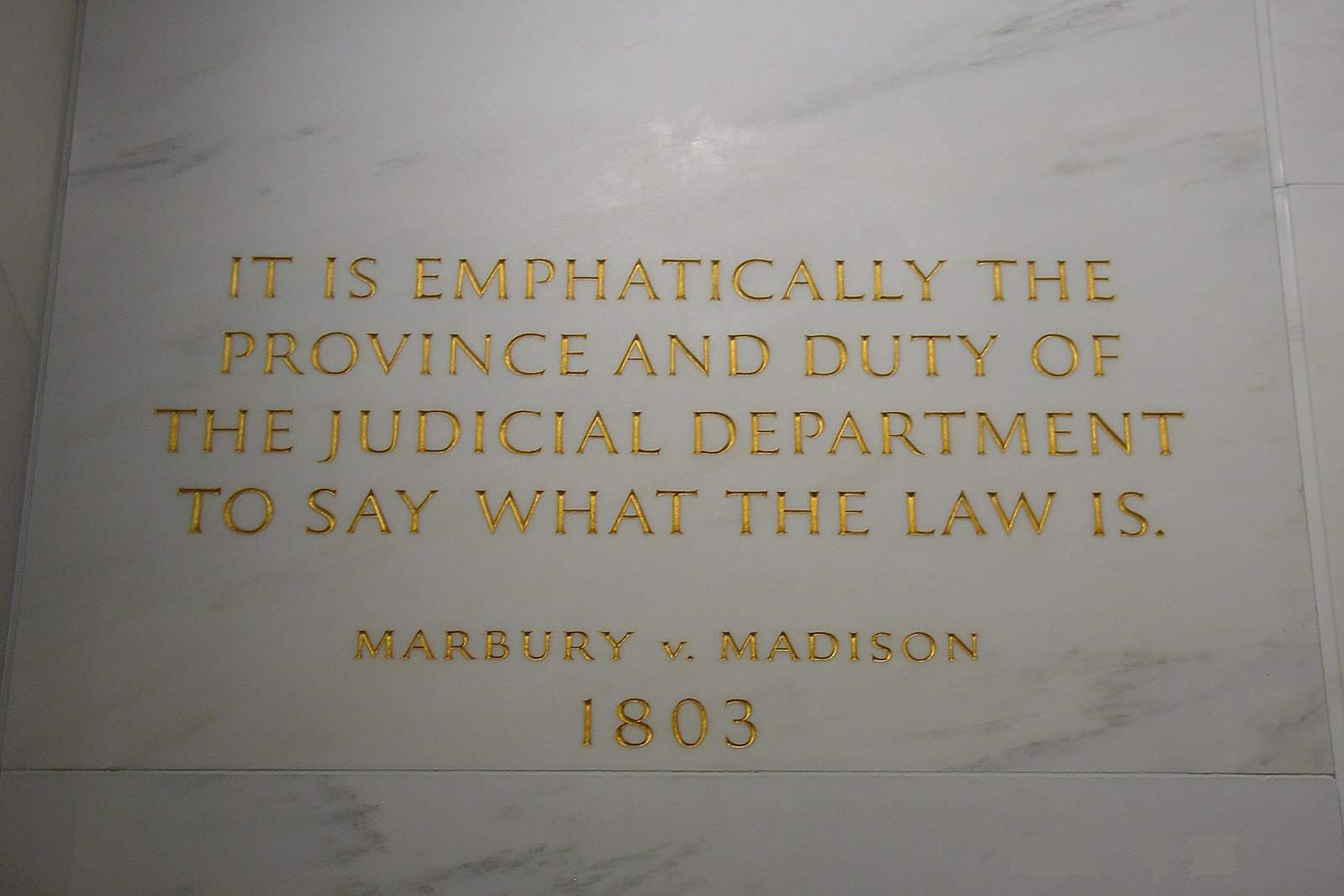 ״זה הכרחי כי הרשות השופטת תקבע מהו החוק״, פסק הדין בעניין מרבורי נגד מדיסון חקוק באותיות זהב על קירות בית המשפט העליון בארה״ב