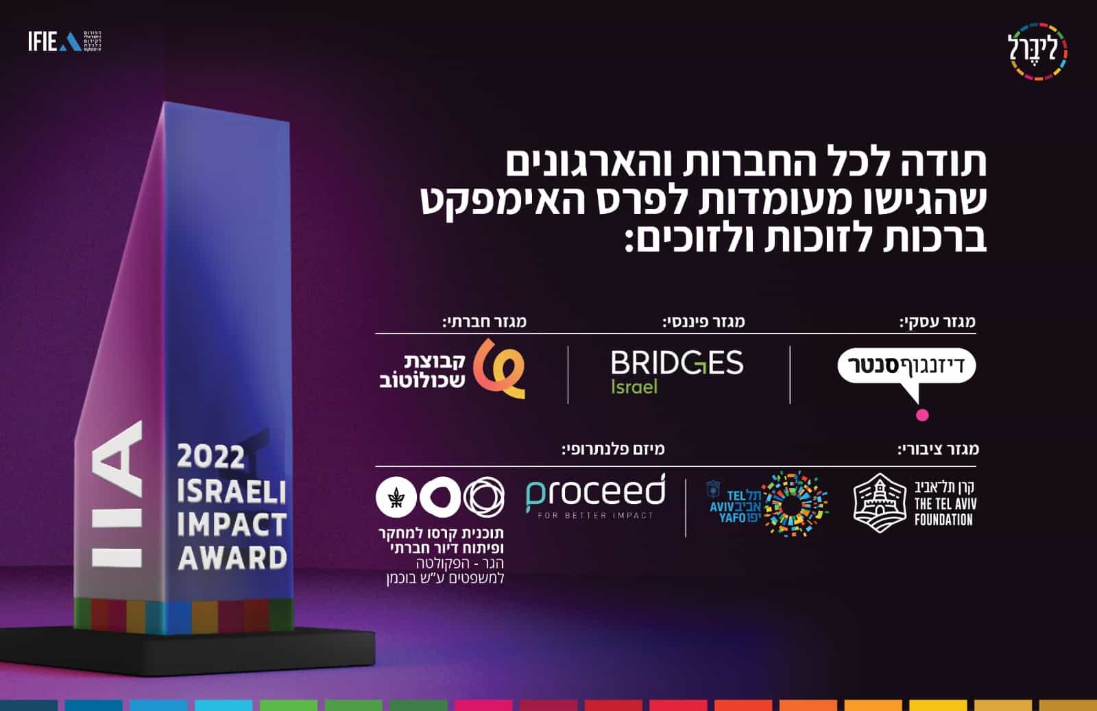 "ליברל תקשורת" והפורום הישראלי לקידום כלכלת אימפקט חברו יחד כדי להציב לראשונה סטנדרט של איכות שאליו יוכלו מיזמי ויזמי אימפקט לשאוף, להאיר בזרקור גופים וארגונים אשר מהווים השראה לעשיית אימפקט ישראלית, ולהביע הערכה לארגונים מהמגזר הפרטי, החברתי, הציבורי והפילנתרופי, אשר מקדמים בעשייתם שורת ערך כפולה – כלכלית וחברתית־סביבתית. כל זאת באמצעות הענקת פרס ראשון מסוגו בישראל – פרס האימפקט הישראלי.