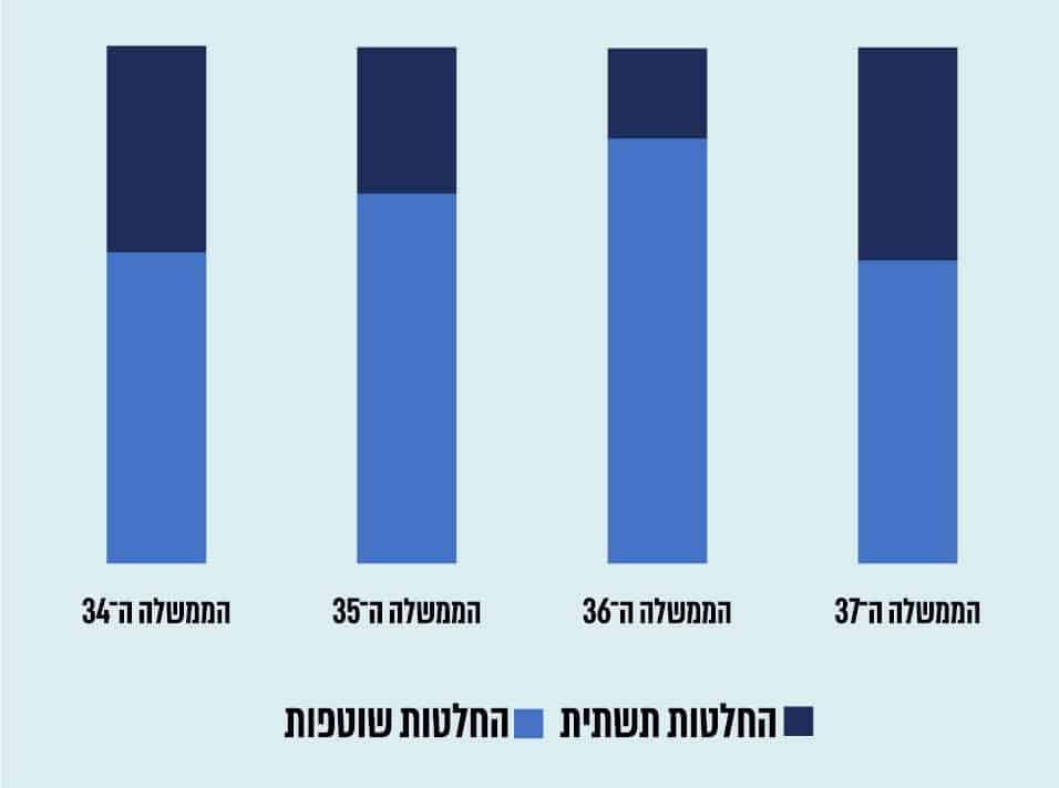 חודשיים וחצי לאחר כינונה של הממשלה ה־37, זהו זמן טוב להתבונן בעשייתה של הממשלה בתקופה הזו ולבחון במה, אם בכלל, היא שונה מהממשלות הקודמות. דרך טובה לבחון זאת היא להסתכל על העשייה הממשלתית באמצעות אחד הכלים המשמעותיים של הממשלה לקידום מדיניות – החלטות ממשלה.כאשר ממשלה נבחרת, הבוחרים מצפים שהיא תקדם את סדר היום כפי שהתחייבו נציגיה השונים בקמפיין הבחירות, ועל פי המחויבות שלה לכלל האזרחים להתמודד עם בעיות מדיניות, גם אם היא אינה אחראית על היווצרותן ולא התייחסה אליהן בקמפיין הבחירות. אנו, האזרחים, מצפים מהממשלה כי תעסוק בענייני יוקר המחיה, עומס בכבישים, ביטחון אישי, חינוך ורווחה ועוד. לא מחליטיםאחד הכלים שעומדים לרשות הממשלות בישראל לקידום מדיניות, הוא החלטות ממשלה. החלטות ממשלה מתקבלות בישיבת הממשלה השבועית המתקיימת בכל יום ראשון. בישיבה זו דנים בהחלטות על הצעות חוק שהממשלה רוצה לקדם, מינויים, תוכניות מדיניות, שינויים תקציבים ועוד. בישראל אין הנחיה בנוגע לשאלה אילו נושאים צריכים להגיע לשולחן הממשלה ואילו יכולים להיות מטופלים ברמת המשרד. שר שרוצה לקדם נושא מסוים בהחלטת ממשלה מגיש את בקשתו לאישור דרך מזכירות הממשלה, ואם בקשתו מתקבלת ההחלטה נכנסת לסדר היום של ישיבת הממשלה. החלטות ממשלה מתקבלות באופן קולקטיבי על ידי רוב השרים המשתתפים בישיבה. בכל שנה מתקבלות כ־ 400 החלטות שונות, ובחינה שלהן מאפשרת לנו לראות את סדר היום של הממשלה ואת מידת פעלתנותה. פעמים רבות אומרים כי הממשלה צריכה להוכיח את עצמה בחודשים הראשונים לקיומה. על כן, כדי לבדוק אילו ממשלות היו פעילות יותר, בדקנו את היקף וסוג הפעילות של ארבע ממשלות ישראל בחודשיים הראשונים לכהונתן: ממשלת נתניהו (34) שהוקמה ב־2015; ממשלת נתניהו־גנץ (35) שהוקמה ב־2020; ממשלת בנט־לפיד (36) שהוקמה ב־2021; וממשלת נתניהו (37) שהוקמה ב־2022. בתרשים 1 ניתן לראות את היקף הפעילות של הממשלה מבחינת סך כל ההחלטות שהיא קיבלה בחודשיים הראשונים לכהונתה.תרשים 1: כמות החלטות הממשלה בחודשיים הראשוניםבמבט כללי על החלטות הממשלה שהתקבלו בממשלות אלו, ניתן לראות כי הממשלה ה־36 קיבלה מספר גבוה יותר של החלטות ממשלה בחודשיים הראשונים – 288 החלטות, ואילו הממשלה ה־37 קיבלה את המספר הנמוך ביותר של החלטות ממשלה – 118. ייתכן כי הדבר קשור בעובדה כי הממשלה ה־36 כונתה "ממשלת השינוי", וככל הנראה שאיפתם של חברי הממשלה החדשה להוכיח את עצמם, לקבוע עובדות בשטח ולקדם את השינוי שאותו רצו להשיג הובילה לכך שקיבלו מספר רב יותר החלטות ממשלה, בעיקר בתחילת הדרך. גם ממשלת גנץ־נתניהו (35) קיבלה הרבה החלטות בהשוואה לשתי ממשלות נתניהו האחרות. זאת על אף הקושי המובנה שהיה לממשלה זו, בשל היותה ממשלת חליפין עם שותפים שרמת האמון ביניהם נמוכה מאוד. תקועים בשלב התשתיתראיה נוספת לכך שהממשלה הנוכחית טרם החלה לעבוד, ניתן לראות גם בפילוח החלטות הממשלה לפי סוג. כאשר ממשלה מתחילה את עבודתה, היא בונה את היסודות הבסיסיים אשר יסייעו לה בהמשך במימוש המדיניות. יסודות אלה כוללים הקמת משרדים חדשים או ביטול קיימים, מינוי שרים, סגנים ומנכ"לים, הקמת גופים ממשלתיים והקמת ועדות שרים העוסקות בנושאים שונים ובכך מסייעות לממשלה בעבודתה. החלטות אלו הן החלטות תשתית, ולכן אך טבעי שרוב ההחלטות הראשונות של ממשלה חדשה יהיו החלטות מסוג זה. גם כאן, נראה שהממשלה ה־37 יוצאת דופן, שכן גם בתום חודשיים לכהונתה מרבית ההחלטות שלה הן החלטות תשתית. על פי ההשוואה בתרשים 2, נראה שהממשלה ה־36 קיבלה את המספר המועט ביותר של החלטות תשתית ביחס לכמות ההחלטות הכוללת. פחות מ־18% מההחלטות שהתקבלו בחודשיים הראשונים לממשלה היו החלטות שבהן נקבעה חלוקת המשרדים, מונו שרים ומנכ"לים ונקבעה חלוקת התקנים בממשלה, לעומת הממשלה ה־37, שעדיין בתחילת דרכה אך כמעט מחצית מההחלטות שהתקבלו עד כה (41%) הן החלטות תשתית.החלטות תשתית אומנם חיוניות לעבודת הממשלה, אך לצד זאת מצופה מהממש