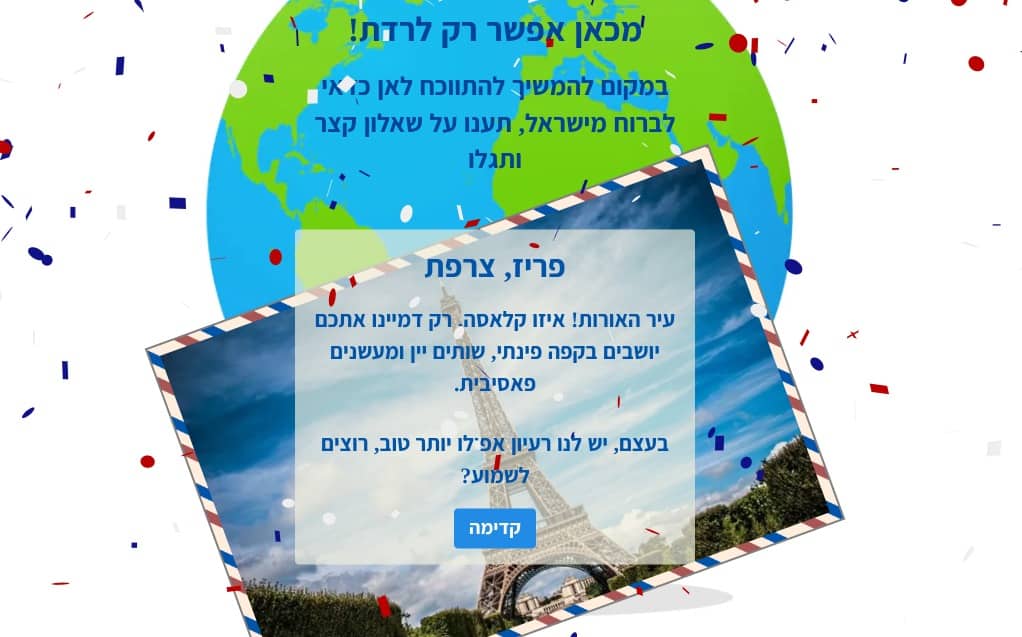 שם: איתמר וילףדיי ג׳וב: השתחרר משירות קבע לפני כמה חודשיםעומד מאחורי: אתרyordim-ilובעוד כמה מילים…״מתחילת המחאה בניתי כבר כמה אתרים עם מידע לגבי ההפגנות. הראשון היה ״יורדים״, שהתחיל כחצי בדיחה. האתר הגיע תוך כמה שבועות ל-140 אלף כניסות. בהתחלה קיבלתי הרבה תגובות משועשעות, אבל אחרי שראיתי שיש כאן פוטנציאל להשתמש בהומור כדי לגרום לאנשים לצאת ולפעול, החלטתי להשתמש בו כדי לנסות ולהניע אנשים לפעולה. אז הוספתי עוד שלב במסלול של הגולשים, שבו קראתי לציבור לצאת ולהפגין, והפניתי למידע על הפגנות קרובות״.למה יזמת את זה?״רציתי לנצל את השיח הפסימי של ארוחות שישי בנוגע לשאלה החוזרת ׳לאן יורדים?׳ כדי לנסות ולהניע אנשים לפעולה. אני לא יודע כמה זה הניע לפעולה אמיתית, אבל זה עורר שיח והעלה חיוך - שזה מספיק טוב מבחינתי״.מה עוד צריך לעשות לדעתך?״כרגע במטה המחאה יש שני כיוונים מרכזיים שהם מאוד שונים אחד מהשני - יש את החבר׳ה היותר מילטריסטים שרוצים להחריף את השיח, ויש את אלה שרוצים להמשיך את המחאה בגישה יותר פייסנית. אני חושב שהגישה צריכה להיות שילוב מסוים של שניהם. כל הזמן צצים עוד רעיונות חדשים ומקוריים באזורים הדיגיטליים או הפיזיים ולכולם יכול וצריך להיות מקום במרחב הנוכחי שיצרנו״.