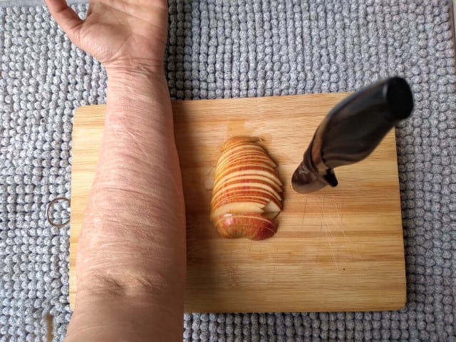 רוני שרה בר, משתתפת בקורס הצילום דרך עמותת הלל ליוצאים בשאלה: ״אני חרדית לשעבר, או כמו שאני קוראת לזה ״חוזרת בתשובה לעצמי״. אני אמנית מגיל צעיר – מגיל 4 כבר ישבתי בשולחנות של גדולים בחוגי אמנות, עד היום אני יוצרת. לפני הקורס עבדתי בתחום הכושר, אבל הרגשתי שנמאס לי שהגוף הוא כרטיס הביקור שלי, ונמאס לי להיות במשטר כזה קשה. רציתי שוקולד. הייתי בתקופה קשה, עד שהבנתי שמה שאני רוצה לעשות בחיים זה אמנות. ״בקורס למדתי צילום, רציתי לראות אם זו אופציה בשבילי, אם אני יכולה לעסוק בזה. אם אמן רוצה להיות מדויק הוא צריך להתפשט, כמו בצל, ולהוריד קליפות עד שיהיה מזוקק. בקורס התחלתי לעשות עם עצמי את התהליך הזה, להשמיע את הקול שלי. נחשפתי לעצמי, מול המנחה, מול הקבוצה. מי אני? מה אני? מה הקול שלי? בדרך כלל חשובה לי האנונימיות שלי, אבל אני מבינה שבתור אמנית אני כבר לא יכולה להישאר בצללים. ״אמן זה אדם עם המון שדים, אבל הוא חייב להוציא אותם החוצה. והקורס הזה היה הזדמנות עבורי להכיר את השדים שלי. באמצעות התוכנית הצלחתי להגיע אליי. זה היה מסע אל תוך עצמי, ואפשרות להשמיע את הקול שלי דרך צילום. לדוגמה, נתנו לי משימה עם תפוחים, ויצאה תמונה שמעוררת הרבה פחדים, סימני שאלה, אומץ, גאווה ובושה – הכל ביחד. התמונה מסמלת מבחינתי את התקופה שבה חתכתי את עצמי. ומה שהתמונה הזו מעוררת – זו התמצית שלי, סקרנות או אי נוחות – זו אני. ״התמונה אומרת הכל. לא צריך לדבר, רק להפעיל את החושים. כשראיתי את התמונה שלי בענק, בתערוכה, הבנתי שזו לא תמונה רגילה, ושאלתי את עצמי מה אחרים חושבים על זה. הצילומים הודפסו גם על גלויות, והתמונה שלי ביניהן. אנשים בחרו להם מזכרת יפה. בדקתי אם אנשים לקחו את הגלויה שלי, כי זו לא סתם תמונה יפה, זו תמונה יותר מורכבת, עם חיים ומוות, ברזל קשה ויד רכה, תקווה ויאוש. אבל אין מה לעשות אני חייבת להביא את עצמי, את כל כולי, גם אם זה מורכב. כולנו בסופו של דבר אנשים מורכבים״.